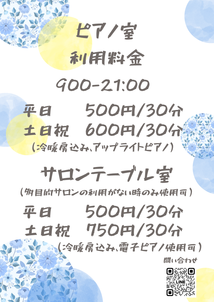 | レンタル スペース | 多目的サロン (グランドピアノ・YAMAHA C3) ピアノ室 (アップライト・YAMAHA) テーブル室 |